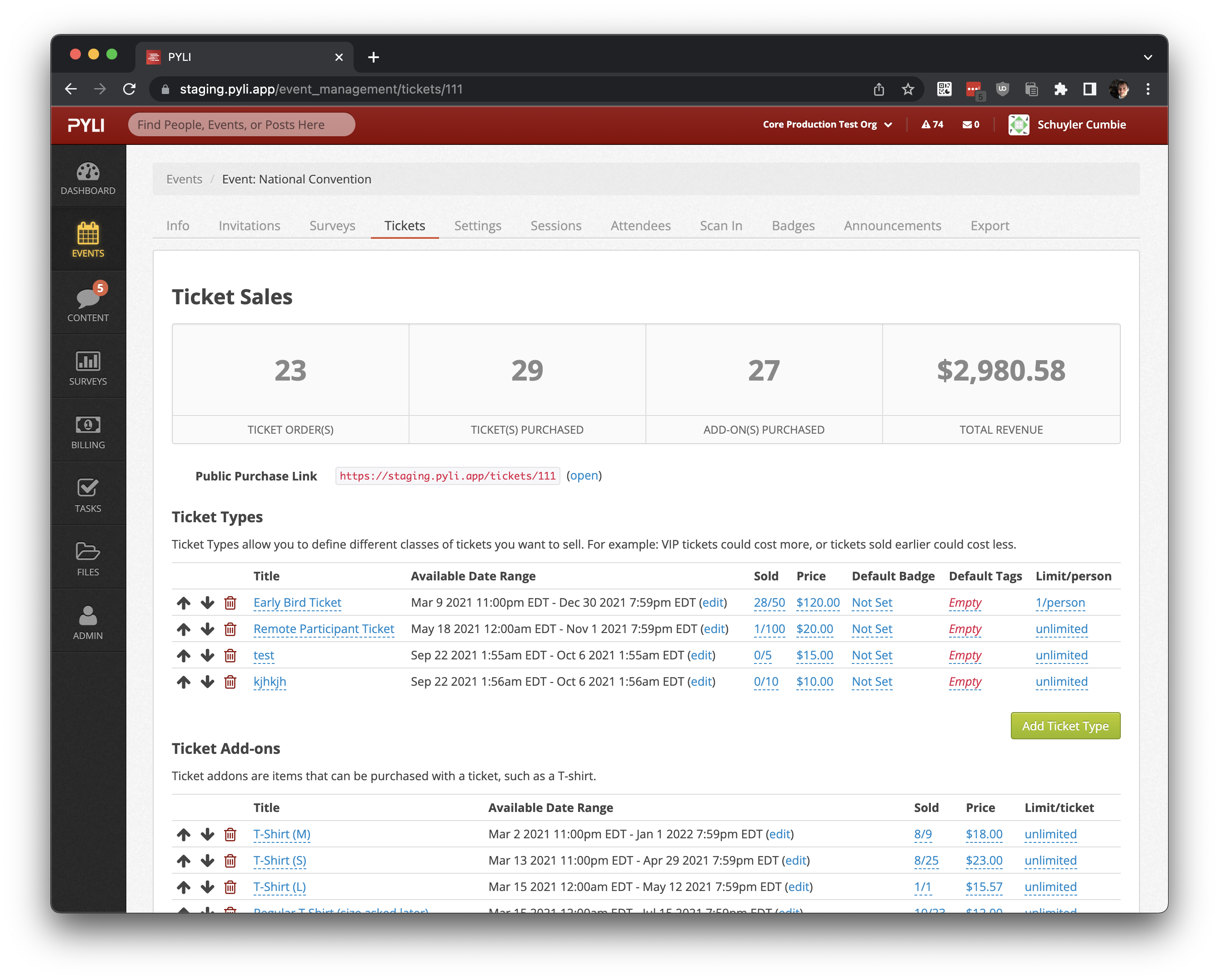 You should now also be able to add tickets, add-ons, and more, as well as obtain a link for sharing your event. This link will be public while enabled and allow anyone to buy tickets when available and enabled.