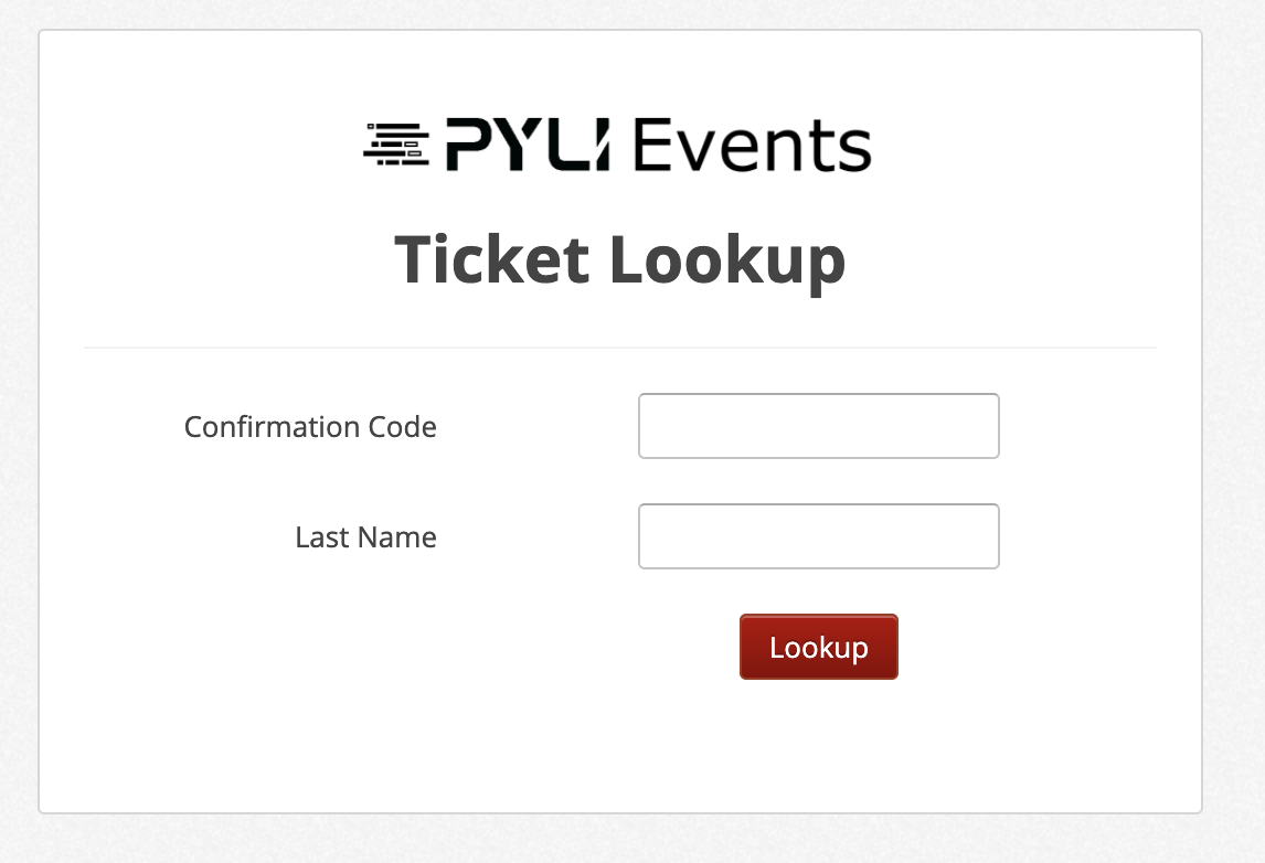 Here you can enter your confirmation code (which can be found in the e-mail sent to you from PYLI right after purchase) and your last name to look up your ticket.